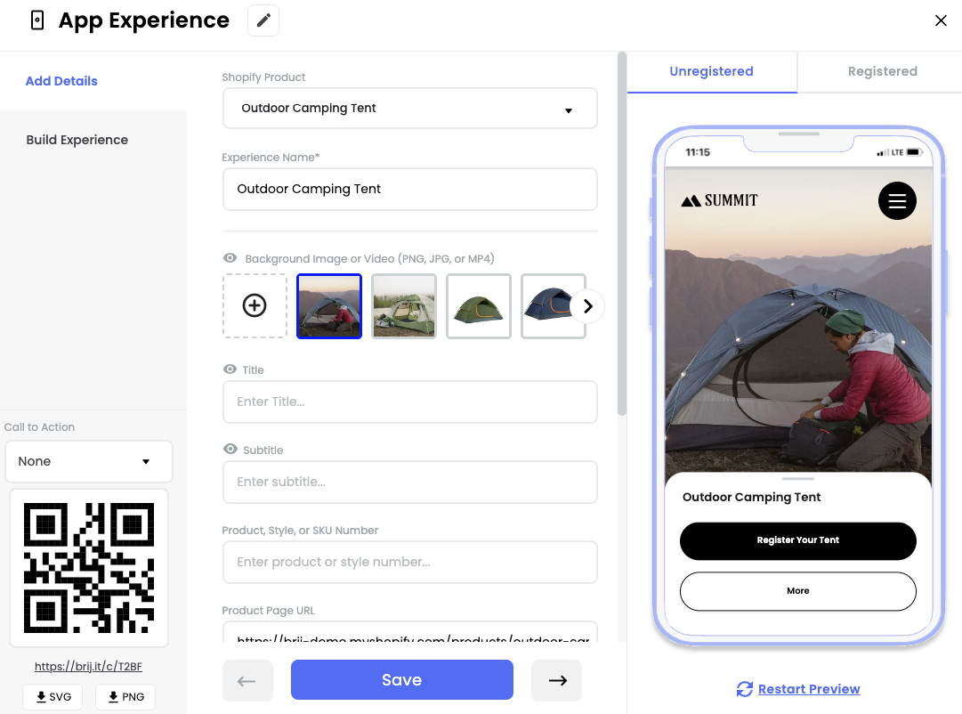 With Brij, you can connect to Shopify and instantly bulk create custom QR codes and destination pages that exactly mirrors your product spread.